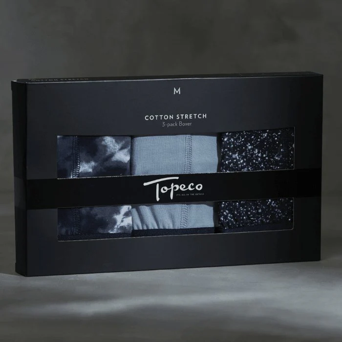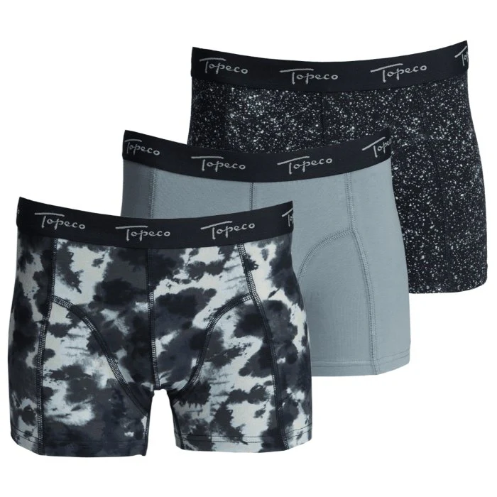 Är du bekant med Topecos kalsonger sedan tidigare känner du säkert igen designen. Medellånga ben och en fantastiskt mjuk och stretchig kvalitet i bomull för en så följsam och bekväm passform som möjligt – och självklart med en fantastiskt snygg look! Här ingår ett sobert enfärgat par i ljusgrått samt ett småfläckigt par i svart, grått och vitt respektive ett par med större flammigt mönster i vitt, grått och marinblått. Alla tre par har marinblå resår.