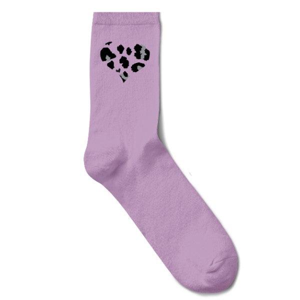 Här har vi ett par strumpor som gillar att synas. Den sprudlande syrenlila botten drar genast ögat till sig. Ett leopardmönstrat hjärta i grått och skaft pryder sedan båda sidor om skaftet som en rolig detalj. Roliga och färgglada damstrumpor som dessutom är tillverkade i hela 72% bambuviskos för optimal komfort.