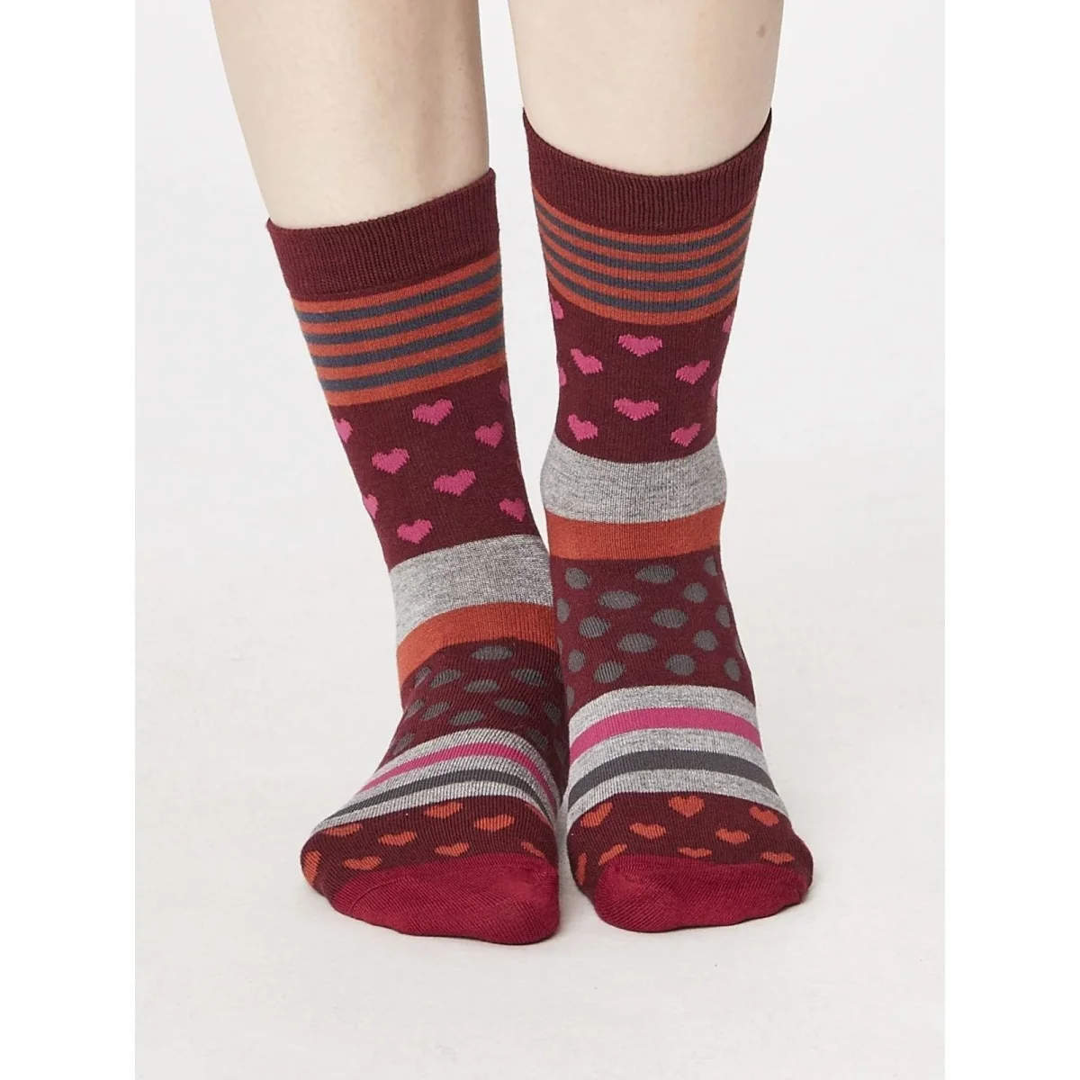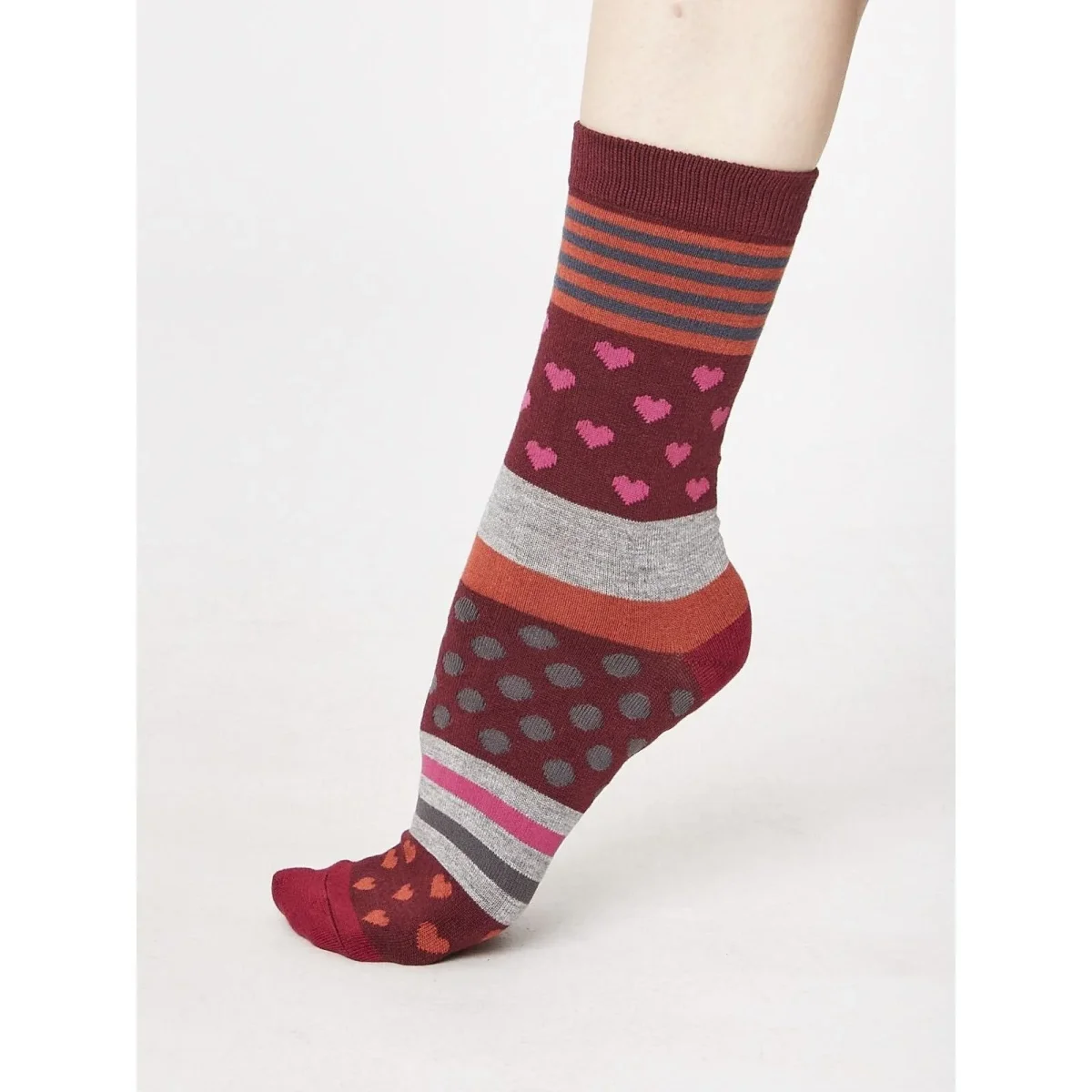 Den lekfulla mixen av olika mönster tillsammans med en intressant färgkombination av vinrött, cerise och grått gör dessutom dessa strumpor extra snygga. Men dessa strumpor är även så mycket mer än bara utseende. De är nämligen tillverkade i bambuviskos som omfamnar dina fötter otroligt mjukt och skonsamt. Är du van vid vanliga strumpor i bomull kommer du garanterat känna stor skillnad i komfort. Bambun ser även till att dina fötter håller sig torra och fräscha.