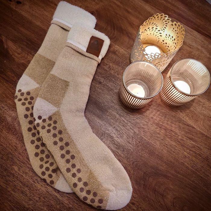 Ett mellanting mellan tofflor och sockor skulle man nog kunna beskriva dem som. En lite kraftigare kvalitet av varm ullblandning, en insida av fluffig frotté och en sula med halkskydd resulterar här i ett par stabila och mysigt värmande raggsockor. Passar lika bra för att använda som ett par tofflor och mysa omkring hemma i som att ha dem för att värma fötterna i under långresan.