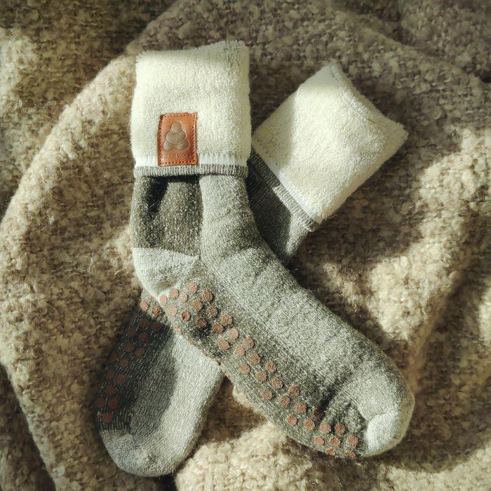 De ultimata raggsockorna skulle man nog kunna säga. Med en insida av fluffig och mjuk frotté omsluter de dina fötter med omsorg och värme. Då de har halkskydd och är lite kraftigare i kvaliteten är de en lite rejälare typ av sockor som med fördel även kan användas som inomhustofflor. Skaftet kan låtas vara nedvikt som på bilden, men kan också dras upp om man önskar ett högre skaft på strumporna.
