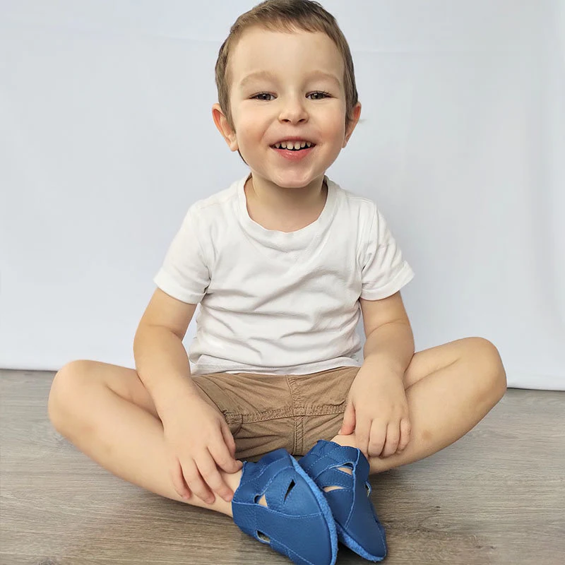 The shoes are easy to get on, by using the flexible ankle band, which stays fixed. We supplied the toe of the shoe, providing enough space for the free movement of toes, and helping a free feet development.