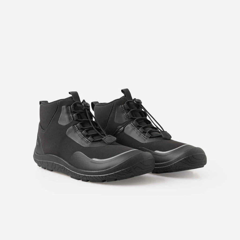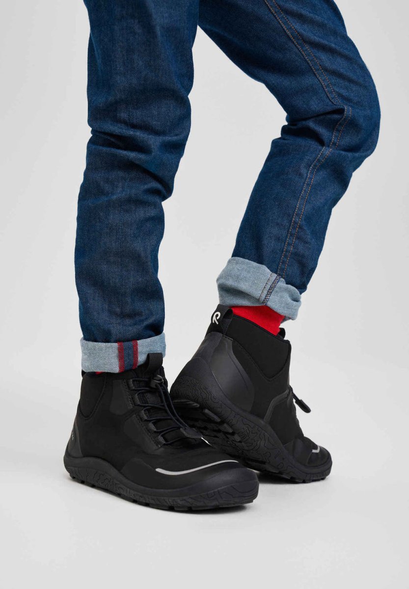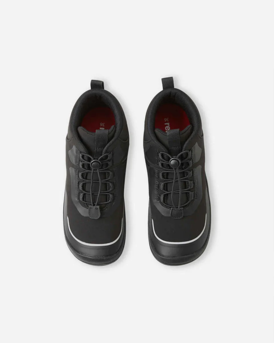 Öppna en äventyrsvärld för barnet med Loikki, vattenavvisande TEX barfotaskor för barn. De högskaftade skorna har ett vattenavvisande membran som håller tårna torra och reflexdetaljer för ökad synlighet. Ett smidigt kardborrband och elastiska skosnören ger en personlig passform, och designen utan höjdskillnad mellan fot och häl främjar en naturlig hållning. Den elastiska innersulan och breda lästen ger extra utrymme för små tår, och den gummiliknande yttersulan ger utmärkt grepp. Dessa veganvänliga skor med uttagbara innersulor och bekvämt foder är utmärkta för vår och höst, och alla väder.