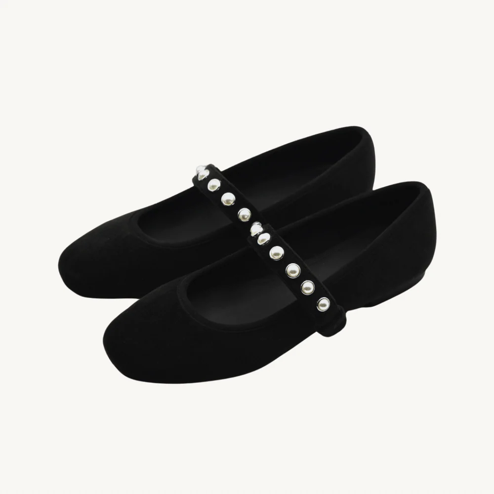 Bekväm ballerina i Mary Jane-modell med rem över foten, i högkvalitativ sammet med pärldetaljer över bandet. Dessa ballerinaskor passar lika bra som kontorsskor som för en dag på stan eller en festkväll, tack vare den genomarbetade designen och sulans bekvämlighet. Mary Janes ballerinas utmärks av bandet över fotryggen, denna variant har ett band prytt med pärlor och har även en elastisk bit för optimal bekvämlighet.