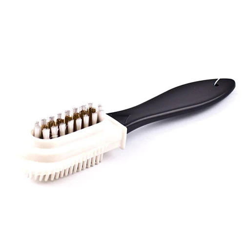 Gummiborst på ena sidan, mässing och nylonborst på den andra.