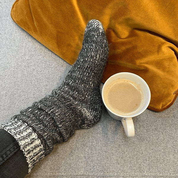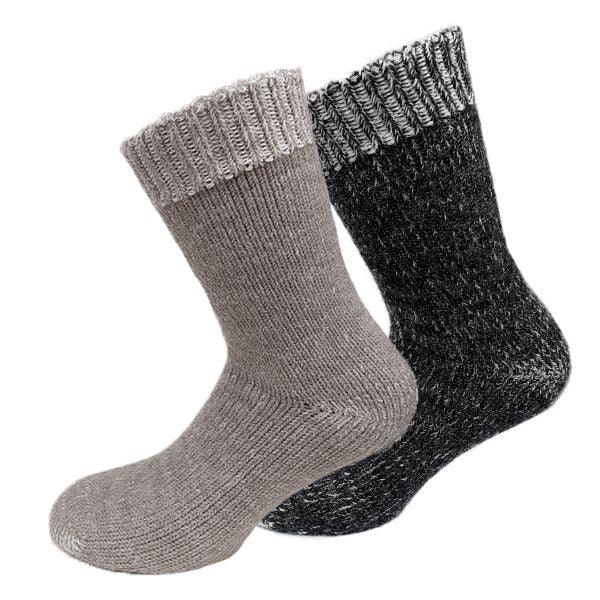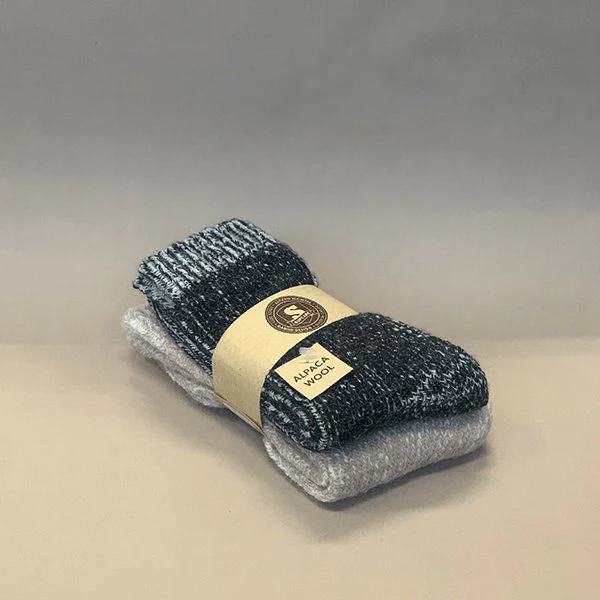 Vill du skämma bort dina fötter lite extra i kylan? Dessa otroligt mjuka raggsockor kommer garanterat göra just detta. De innehåller alpackaull som är en extra fin och mjuk sorts ull. Den är också både varmare och mer slitstark än den mer vanliga fårullen. Båda paren är melerade i färgen, ena paret i mörkgrått och vitt och andra paret i beige och vitt. Detta i kombination med de långa, mjuka stråna i strumporna bidrar till en lite fluffig och extra gosig effekt.
