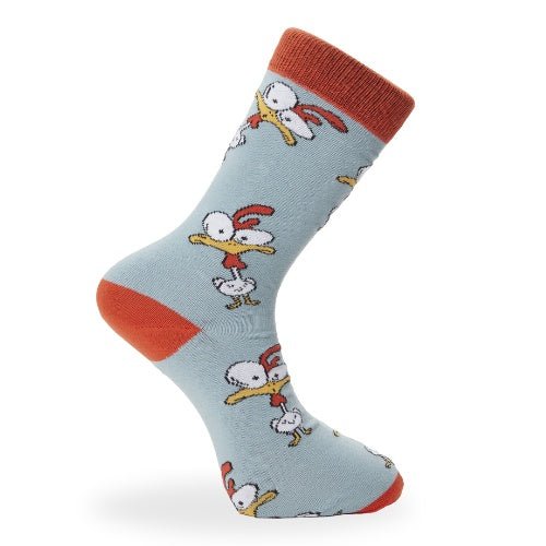 Strumporna har en grågrön botten som pryds med ett motiv av karikatyrtecknade tuppar i vitt, gult och orange. Detta matchas med en orange tå, häl och resår för en effektfull kontrast.