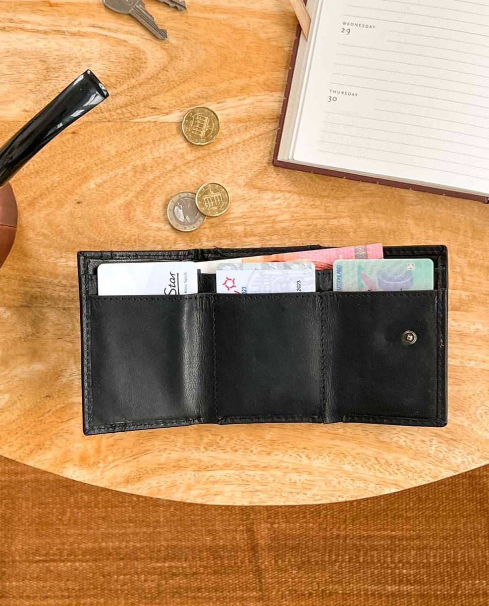 Som en riktigt praktisk plånbok sig bör har ”Ronald” plats för både kort och kontanter. 3 stycken kort får plats i varsin ficka, sedlar och kvitton förvarar du i sedelfacken och mynten har ett separat litet fack som stängs med tryckknapp. Hela plånboken försluts genom att vikas ihop och sedan stängas med en tryckknapp. Som sista detalj finns det ytterligare ett litet fack på baksidan. Ner med plånboken ”Ronald” i byxfickan och du är redo för dagen!