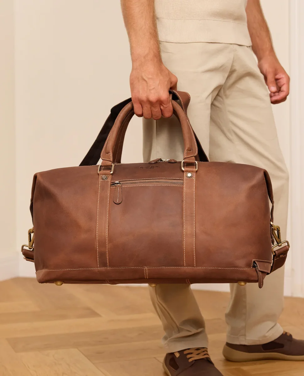 Ska du på en weekendresa och vill inte ta med dig den stora resväskan? Då rekommenderar vi vår resväska ”Ruben”. Det robusta lädret är extremt stabilt och högkvalitativt, så denna väska kommer garanterat att följa dig under lång tid. Den enkla vintage-designen talar också för denna resväska, som kommer att dra avundsjuka blickar till dig på tågstationer och flygplatser. En läderväska som alltid kombinerar avslappnad stil med elegans. Helheten kompletteras av ett diskret integrerat AirTag-fack och en praktisk nyckelring som garanterar ordning och snabb åtkomst. Den avtagbara och justerbara axelremmen ger extra flexibilitet, så att du kan bära ”Ruben” precis som du vill.