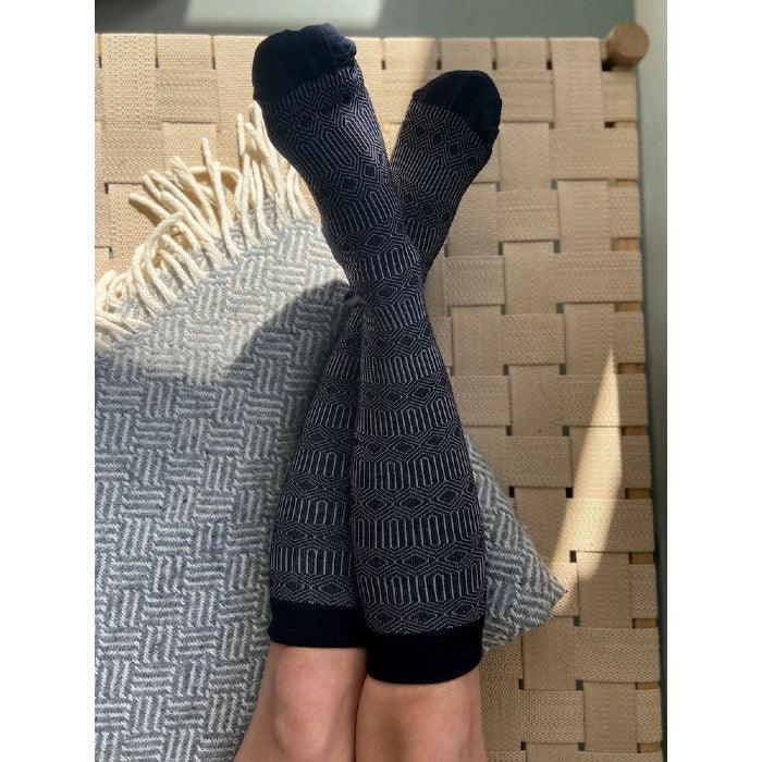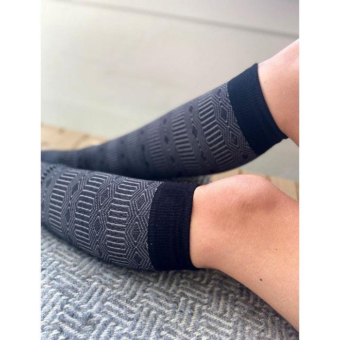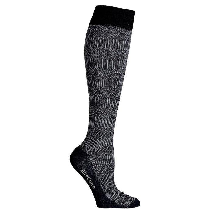 Bär dina stödstrumpor med stil. En svart botten och ett stilrent mönster i vitt gör dessa stödstrumpor till ett sobert och dressat val på dina ben och fötter. Passar utmärkt både till vardags och när du vill känna dig lite extra välklädd. Dessutom tillför hela 50% bambuviskos en extra känsla lyx och komfort som håller i hel dagen. Läs mer om alla fördelar i punktlistan nedan.