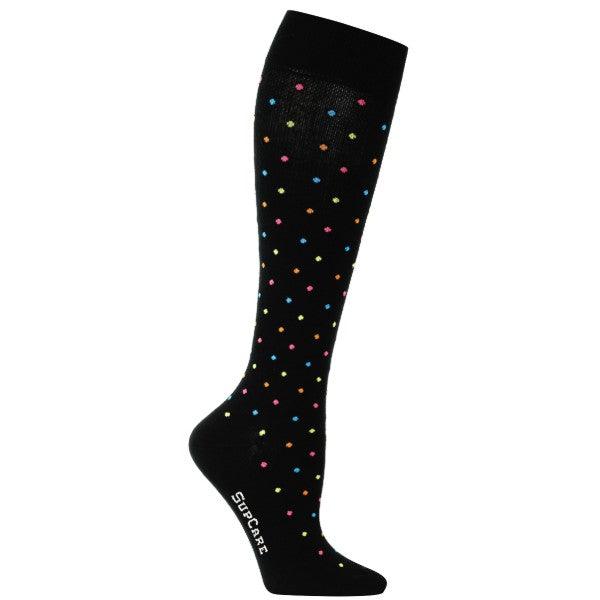 Vi ser strumpor och stödstrumpor som en rolig chans att sätta en egen och personlig prägel på sin outfit. Detta småprickiga par är ett exempel på ett diskret alternativ som sticker ut sådär lagom mycket, men som ändå ger ett personligt intryck. Dessutom har de ett vadomfång upp till 46 centimeter – perfekt för dig med lite kraftigare ben.