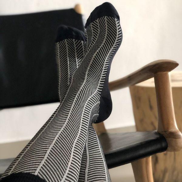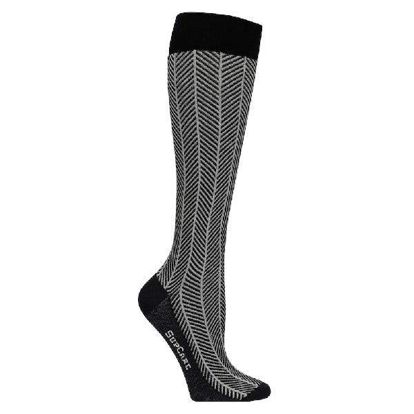 Tillför lite glamour i vardagen med ett par glittriga stödstrumpor! Fiskbensmönstrat i beige och svart i kombination med glitter utgör här den perfekta kombon både till vardag och fest. De glittriga ränderna är diskreta och blir exakt sådär lagom festliga. Den mjuka bomullsblandningen ger en känsla av ett par vanliga strumpor, med kompressionen som ett extra plus. De är alltså väldigt sköna och behagliga att ha på sig.