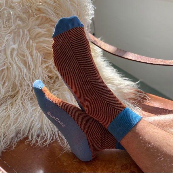 Beroende på vilket väder det är och på vilka byxor man har på sig kan det ibland kännas lite för varmt eller för osmidigt med ett par knähöga stödstrumpor. Då är ett kortare skaft ett utmärkt alternativ. De bidrar fortfarande med en ökad blodcirkulation, men ser ut som vilka andra strumpor som helst. Perfekt för lite varmare dagar eller när du bär byxor med smala ben. Dessa stödstrumpor med kort skaft är like snygga på män som kvinnor och blir en rolig färgklick i vardagen. Tack vare bambuviskosen känns de dessutom extra mjuka och skonsamma mot huden.