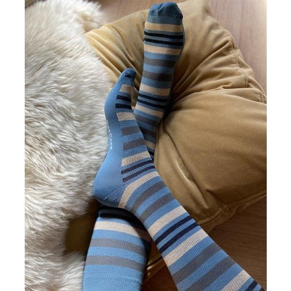 Låt din personlighet lysa fram genom valet av dina stödstrumpor. Många av oss bär kostymer eller någon annan form av arbetsuniform hela dagarna långa, men något som vi oftast fortfarande får bestämma över själva är just strumporna. Det är här vi har möjligheten att fortfarande uttrycka oss själva i form av färger och mönster. Även om strumporna kanske inte syns särskilt mycket så gör det fortfarande mycket för själva känslan när du bär dem. Denna randiga modell i bomullsmix är ett bra alternativ till dig som behöver vara stiligt klädd utan att för den delen ge upp dit personliga uttryck.