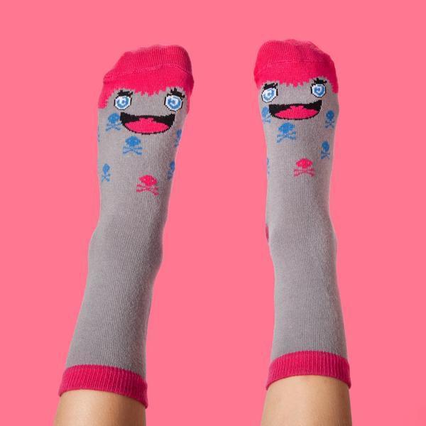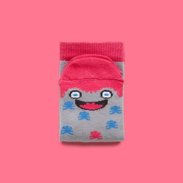 Detta är Miko, en busig och härlig liten tjej med mycket energi. Miko älskar att leka och ser gärna att så många som möjligt är med. Med henne är det alltid full fart och fläkt och en sak är säker – du får aldrig en tråkig stund när Miko är med! Mikos busiga leende pryder både ovan- och undersidan av dessa strumpor för en extra lekfull känsla. Naturligtvis är dessa roliga strumpor tillverkade i mjuk, kammad bomull för extra komfort och bekvämlighet för minstingarnas fötter.