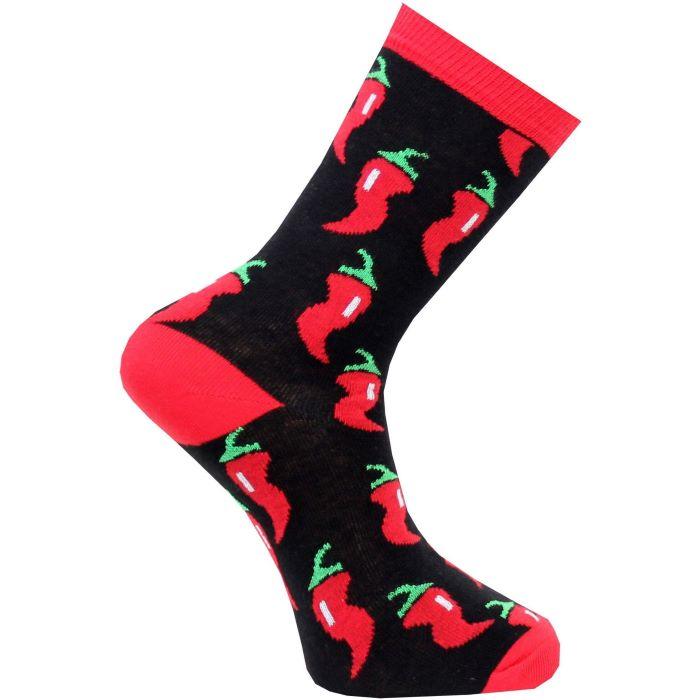 Eldröda chilifrukter mot en kolsvart botten ger ett starkt och häftigt intryck på dina fötter. Roliga och snygga på samma gång och dessutom väldigt bekväma att ha på sig. Med ett par strumpor som dessa blir du garanterat hetast på stan.