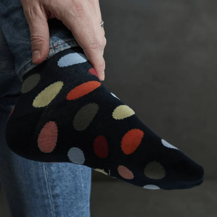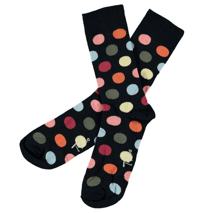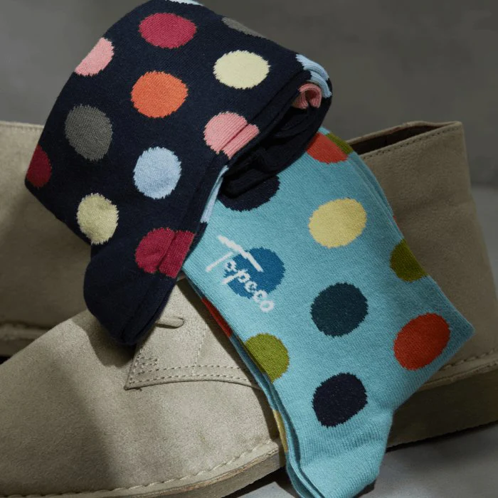 Marinblå strumpor är alltid ett lika säkert kort. De håller dig välklädd och passar till det mesta. Men lägg till ett storprickigt mönster i mjuka pastellfärger såsom rosa, gult och khakigrönt och du får ett par lika dressade strumpor som samtidigt känns trendiga och personliga. Dessa prickiga strumpor från Topeco är alltså ett utmärkt val för dig som söker ett par mönstrade strumpor som sticker ut lagom mycket. Lika perfekta till kostymen som till jeansen.