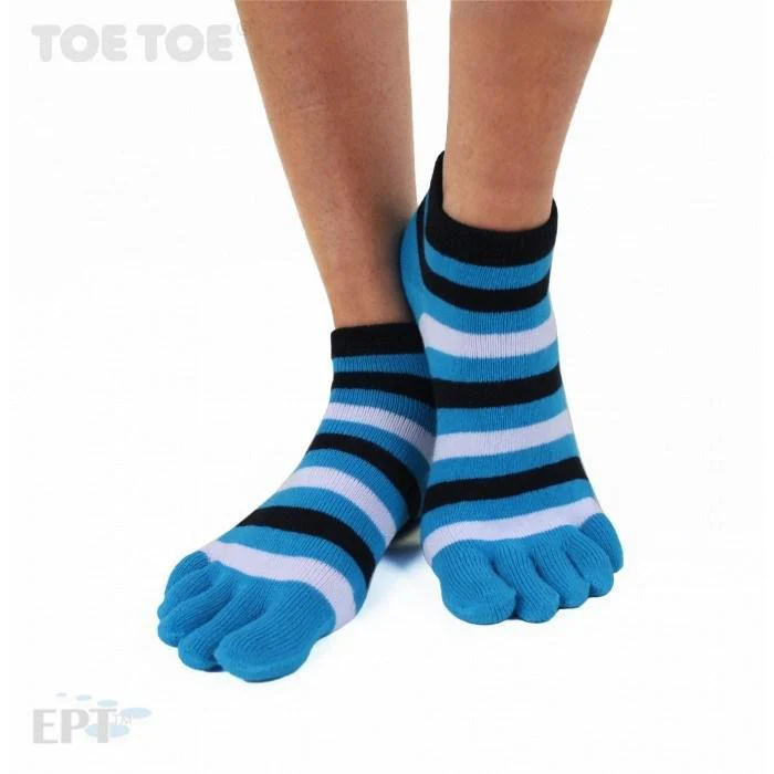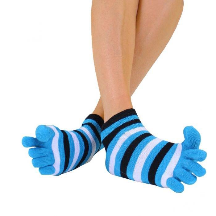 Tack vare sin tåseparerande design ser tåstrumpor till att dina fötter får behålla sin naturliga form och att dina tår får nyttja sitt fulla rörelsemönster. Detta i sin tur håller igång blodcirkulationen och motverkar stela och kalla fötter. Eftersom tårna är separerade bildas inte heller någon fukt och svett mellan dina tår på samma sätt som i vanliga strumpor. Detta motverkar bildningar av fotsvamp och håller dina fötter torra och fräscha mycket längre. Dessa tåstrumpor av ankelmodell har förutom alla dessa egenskaper dessutom en riktigt snygg randig design i färgstarkt turkost, svart och vitt som passar lika bra för både män och kvinnor.