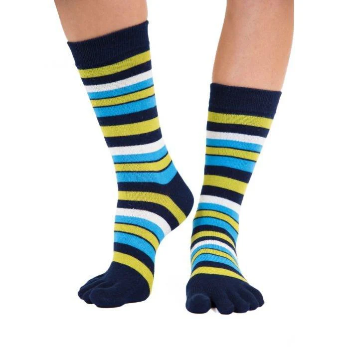 Tåstrumpor faller inte alla i smaken vid första anblicken, men ger du dem en chans kommer du inte att ångra dig! Tåstrumpor är väldigt sköna att bära tack vare sin tåanpassade design som låter dina fötter och tår behålla sin fulla rörelseförmåga. Då tårna ligger separerade bildas heller inte lika mycket fotsvett som i vanliga strumpor. Den fräscha färgkombinationen av marinblått, limegrönt, turkost och vitt får dessutom dessa tåstrumpor att kännas extra roliga och lekfulla.