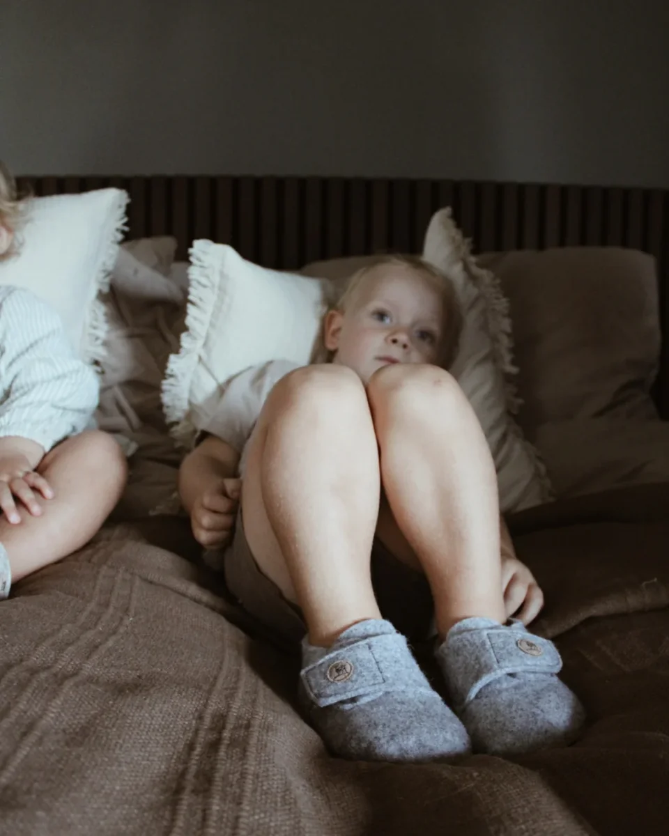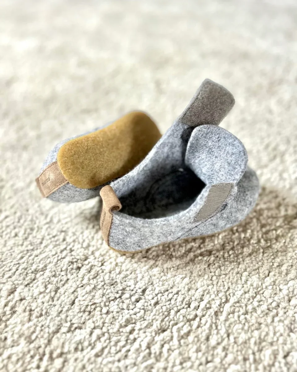 Ullfiltens naturliga egenskaper gör skorna både temperaturreglerande och fukttransporterande, så att de små fötterna förblir torra och varma hela dagen. Med eleganta läderdetaljer och en god passform erbjuder dessa tofflor en stilren och bekväm lösning för alla barns behov. När barnet har tofflorna på är dess fötter endast i kontakt med naturliga material, vilket ger både dig och ditt barn trygghet i att välja en miljövänlig och hållbar produkt.