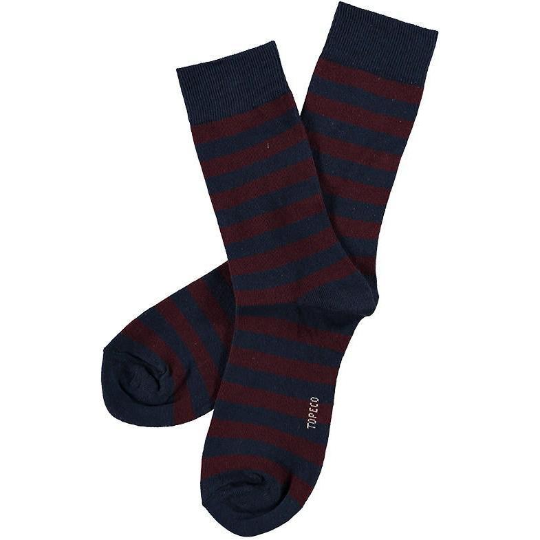 Gärna ett par i en tidlös färgkombination för så användbara strumpor som möjligt. Dessa randiga strumpor från Topeco är en variant på de klassiska röda och marinblå strumporna, men i en mer mättad färgskala. Detta gör att dessa strumpor ger en mjukare kontrast till din övriga klädsel i jämförelse med sina föregångare. Användbara strumpor med andra ord som är lätta att matcha med större delen av din garderob.
