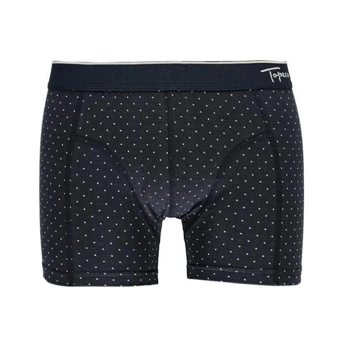 Topeco har precis som vanligt satsat på både komfort och design på dessa småprickiga boxerkalsonger. Noga placerade sömmar för att undvika skav samt en mjuk och skonsam kvalitet i 95% bomull ser till att bekvämligheten är på topp. Den mörkblå och något melerade bottnen med ett småprickigt mönster i vitt ger dessutom en elegant tidlöshet man aldrig tröttnar på.