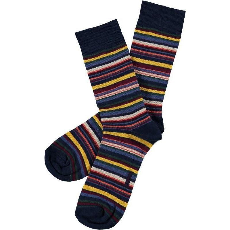 Färgglada och stiliga strumpor från svenska Topeco. De mättade färgerna tillsammans med lekfulla ränder i olika storlekar får strumporna att kännas intressanta och levande på en klädsam nivå. Dessa strumpor leker alltså med färg och form utan att för den delen kännas oseriösa vilket gör att de passar utmärkt till alla möjliga tillfällen. Dessutom finns de i en minst lika snygg brun färgkombination.