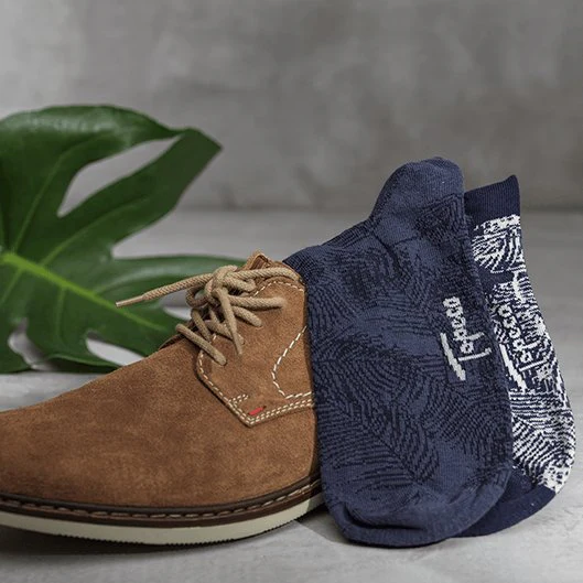 Vem längtar inte till palmer och semester? Med dessa jeansblå herrstrumpor har du med dig palmerna hela dagen om än bara på fötterna. Det diskreta mönstret gör strumporna intressanta på samma gång som de fortfarande är välklädda vilket gör dem perfekta till att bära när som helst, även när du behöver vara lite extra stilig.