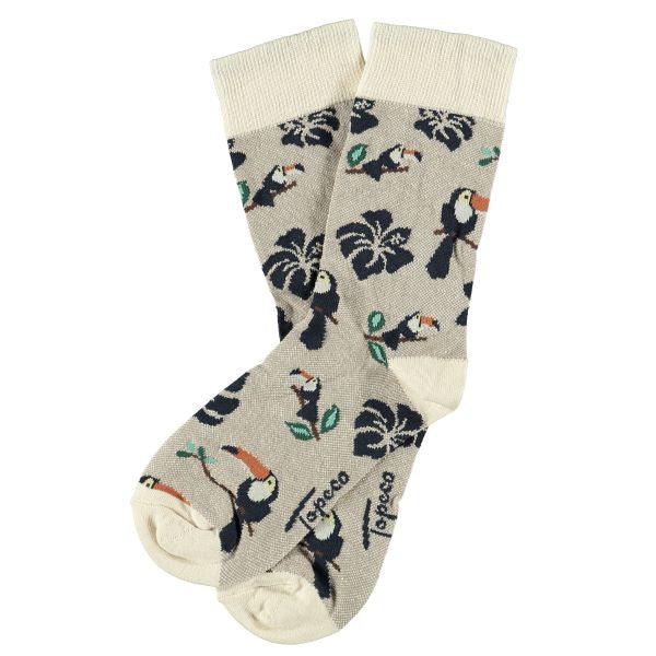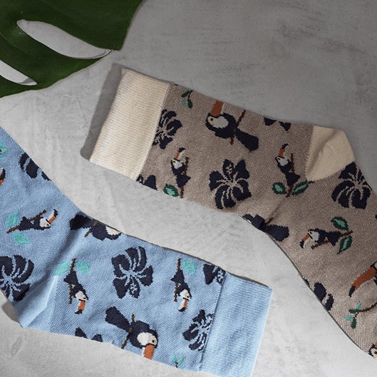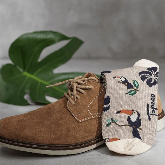 Strumpor är inte bara ett nödvändigt ont utan vilken typ vi väljer har faktiskt en stor betydelse för vilket intryck vi ger. Vad säger då dessa fågelprydda strumpor till exempel? Den diskreta grundfärgen i beige ger med en gång ett välklätt intryck. När man sedan kollar närmare på det lekfulla mönstret med tukaner och stora blommor blir intrycket genast mer lekfullt och personligt samtidigt som de fortfarande är dressade. Roliga strumpor som fortfarande är tillräckligt stiliga för att bära när du behöver vara lite extra välklädd.