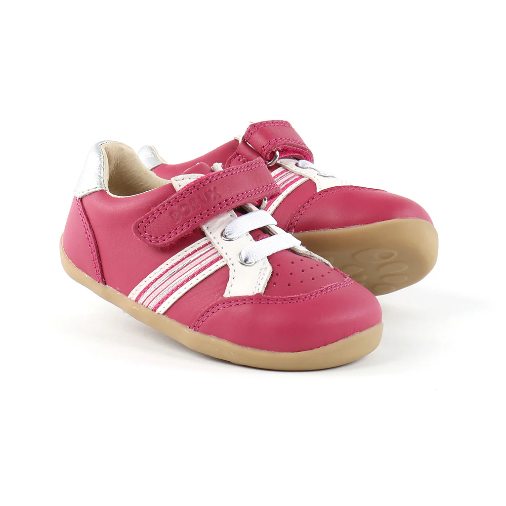 En sportig sneaker som blir supersnygg på vilken liten fot som helst! Mörkrosa med silvriga accenter. Tillverkad i ekologiskt äkta läder som tillåter foten att andas, gör skon hållbar och ger den bästa kvaliteten. Bobux StepUp-skor har en form unikt anpassad för barn som håller på att lära sig gå. Skorna är designade för att ta särskild hänsyn till den runda formen som fötter i detta utvecklingsskede har. Den extremt böjliga och lättviktiga sulan i kombination med det mjuka lädret gör att barnet kan röra sig obehindrat och fötterna kan utvecklas utan begränsning. Barnskons välutvecklade öppning gör de lätta att ta på, och med kardborrebandet justeras skon enkelt till rätt passform.