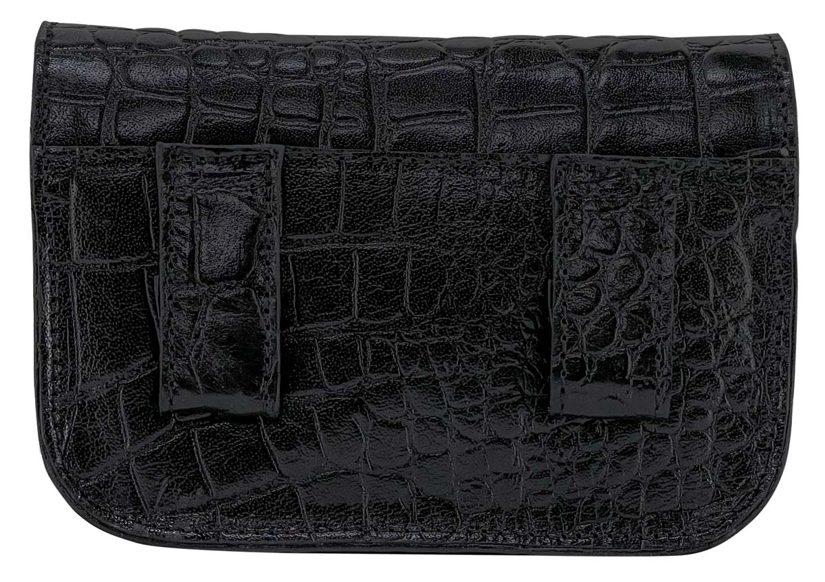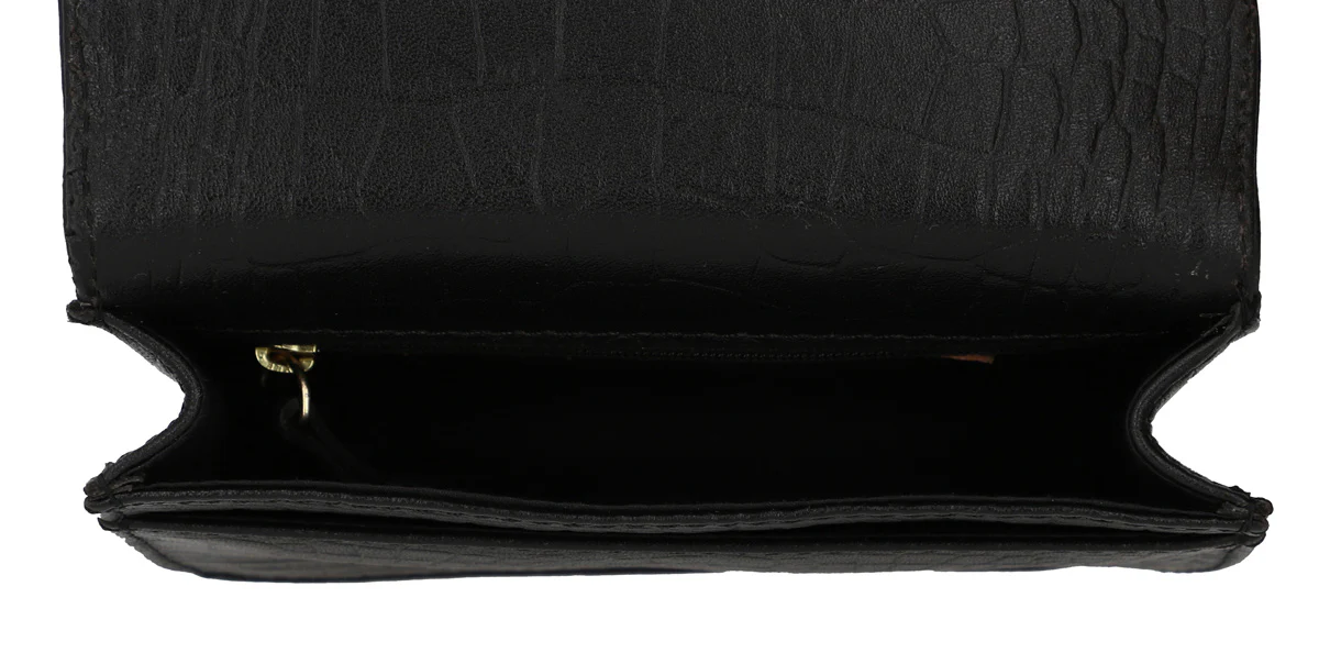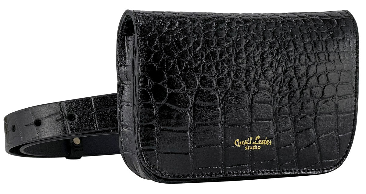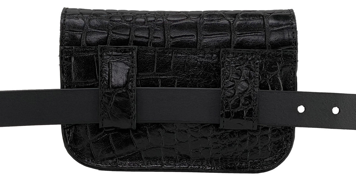 ”Yamila” har ett huvudfack där du har det viktigaste som du vill ta med dig nära till hands. Utan några problem får du här plats med portmonnä, läppstift, nycklar och liknande. Dessutom finns det ett mindre fack på framsidan vilket gör det enkelt att förvara till exempel kort eller kontanter där. Magväskan är gjord av svart buffelläder och dess faux kroko och guldiga detalj gör att den blir en riktig blickfångare och kommer snabbt att bli din nya läderfavorit!