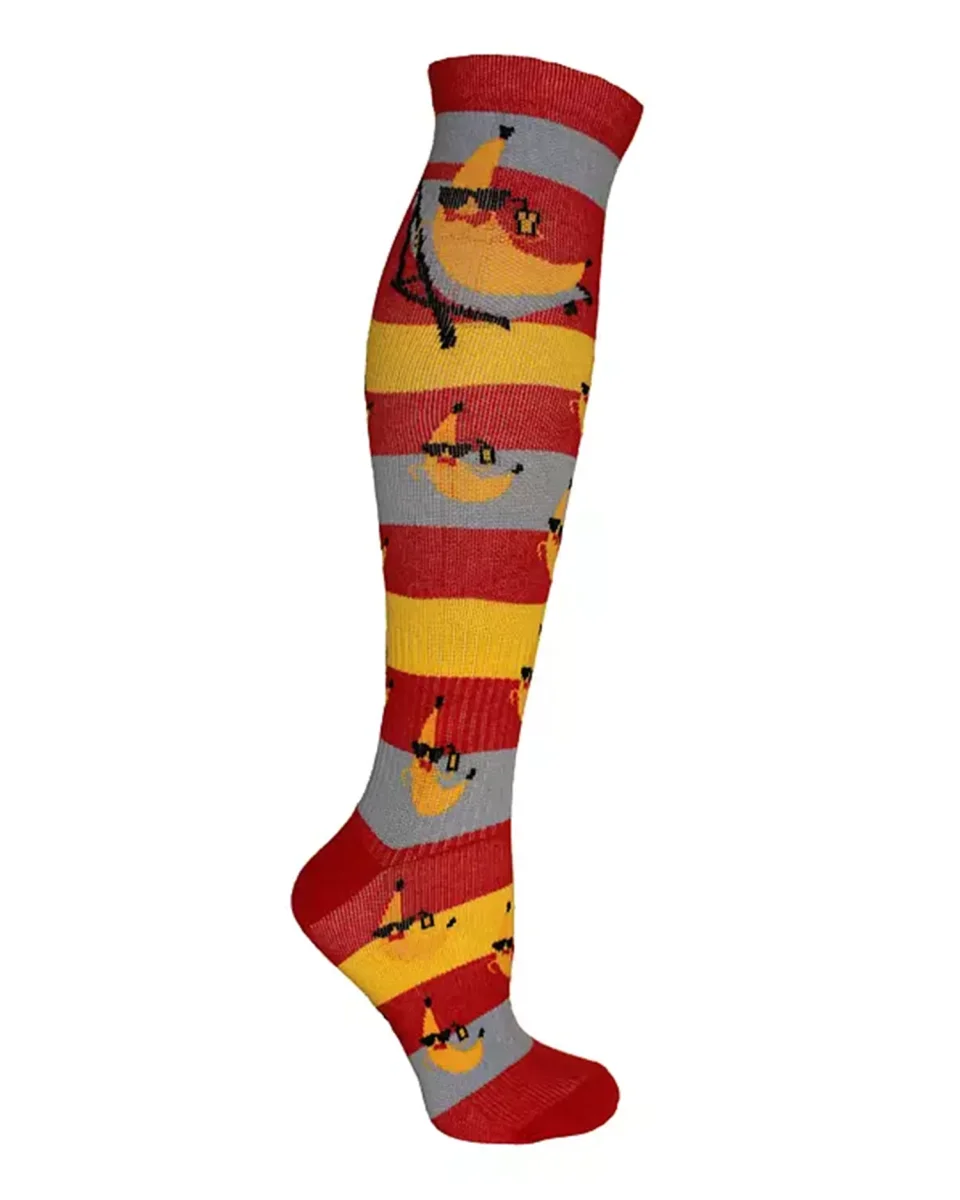Dessa randiga stödstrumpor i rött, grått och gult är mer än bara strumpor – de är ett uttryck för avslappnad coolness och lekfullhet. Med mönster av en coolt solglasögonklädd banan som ligger på en solstol och sippar på en drink är de det ultimata sättet att addera en lekfull twist till din stil.
