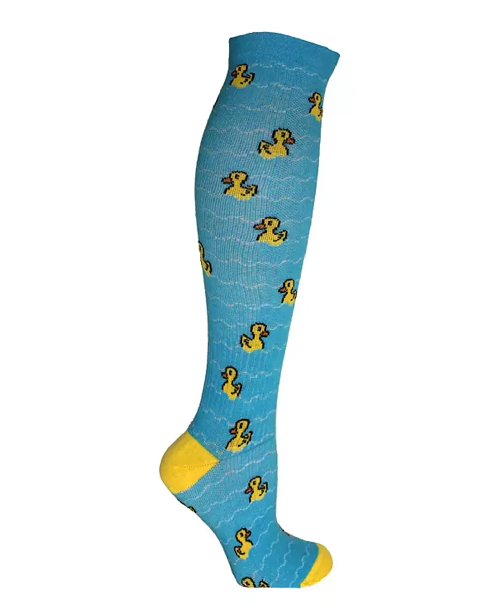 Dessa blåa stödstrumpor med glada gula gummiankor som simmar är som en lekfull touch av glädje för dina fötter. Mönstret ger strumporna en skrattande och bekymmersfri karaktär, perfekt för dem som älskar att addera en dos humor till sin stil.